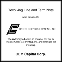 Precise Corporate Printing, Inc., a privately owned commercial and stationery printer headquartered in Brooklyn, New York and primarily serving customers in the New York metropolitan area, retained OEM Capital Corp. to assist it refinance its working credit lines. The refinancing of Precise was arranged through United Jersey Bank.