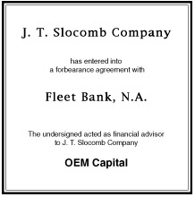 J. T. Slocomb Company, a privately owned supplier of critical components to the major jet engine manufacturers, was unable to react quickly enough to contraction in the military and commercial aerospace markets. This resulted in a severe working capital crisis and defaults in loan covenants. OEM Capital Corp. was able to restructure the business, which led to a successful reorganization of the company under Chapter 11 and substantial recoveries by the lenders and other creditors.