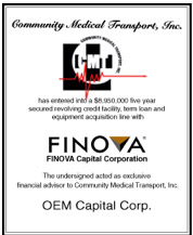 Community Medical Transport, Inc. (“CMTI”), a publicly traded company (NASDAQ: CMTI) based in White Plains, New York, provides medical and other specialized transportation services through its subsidiaries in the greater New York metropolitan area and selected counties of New York and New Jersey. The company suffered declining earnings as a result of an acquisition. This placed it in default of its bank covenants. OEM Capital Corp. assisted the firm to make certain organizational changes and refinance with a finance company.