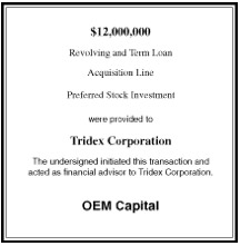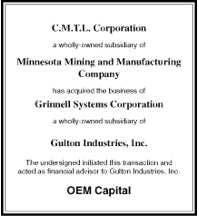 OEM Capital was retained by a growing AMEX-listed manufacturer of specialty printers and high-frequency electronic connectors, to refinance a portion of its debt, secure financing for acquisitions, and improve net worth. The company was facing a redemption date on one of its bonds. OEM Capital Corp. devised a strategy that allowed the company to secure the necessary financing using the sale value of each of its businesses as collateral and assisted in negotiations with Heller Financial, Inc.