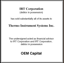 IRT Corporation, debtor in possession, is a publicly held manufacturer of advanced x-ray vision inspection and processcontrol systems, and provides radiation services for sterilization of medical products, improvement of silicon power transistor performance and color enhancement of gemstones. Thermo Instrument Systems Inc., a publicly held company listed on the American Stock Exchange, is a leading manufacturer of analytical instruments used to detect and monitor air pollution, nuclear radioactivity, complex chemical compounds, toxic metals, and other elements in a broad range of substances. Thermo Instrument Systems Inc. is a subsidiary of Thermo Electron Corporation, a New York Stock Exchange listed company with interests in analytical and monitoring instruments, biomedical products, paper making and recycling equipment, alternative-energy systems and other specialized products.