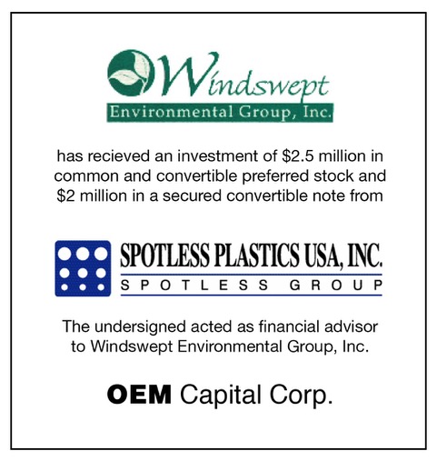 Windswept Environmental Group, Inc., a publicly traded provider of environmental remediation services, retained OEM Capital Corp. to assist in the retirement of debt and repurchase of stock from its controlling shareholder. The transaction was financed by a private placement with Laurus Master Fund, Ltd.